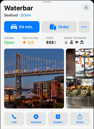 Choose a destination, and its interactive place card shows you everything you need at a glance. See basics like address, hours, website and phone number, along with details like price range, photo galleries, associated Guides, accepted payment types — even whether you can bring your dog. Launch Flyover or Look Around to get a sense of the location and surroundings. You can even quickly and securely rent a bike, pay for parking, order food and more with just a tap. And for places that use Business Chat, you can reach out and ask questions directly in Messages.