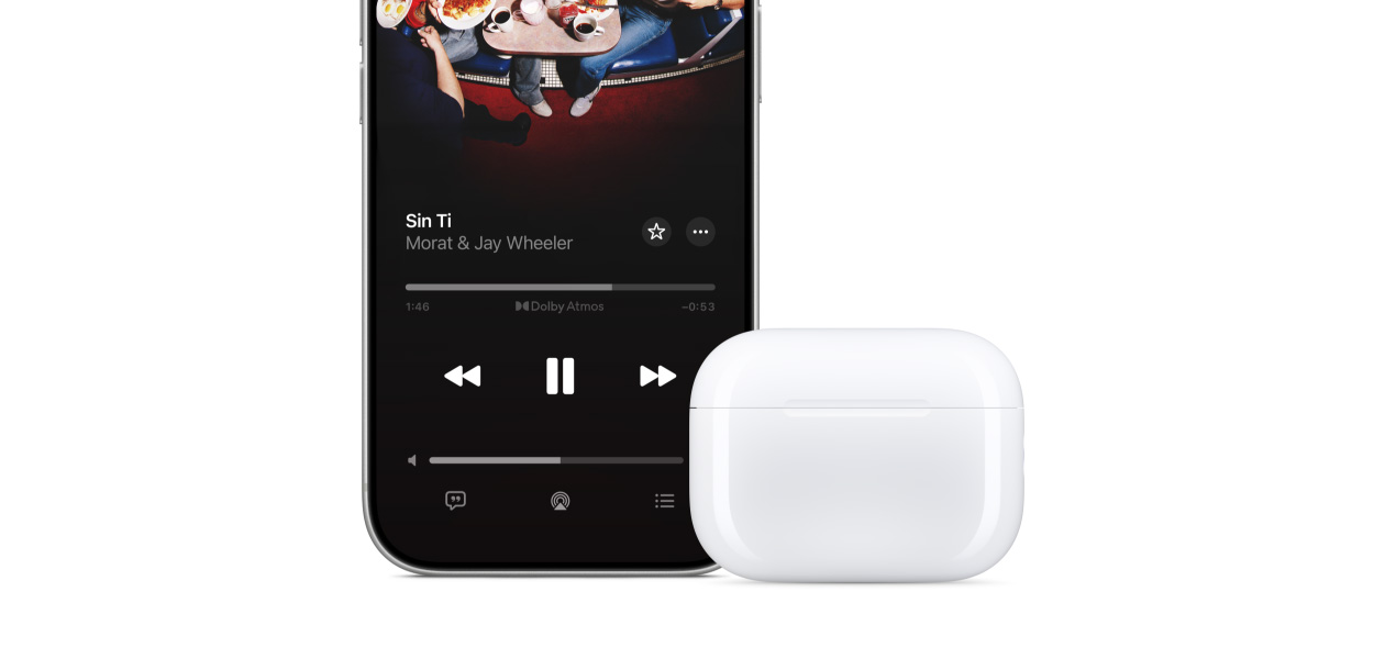 Comparte lo que estás escuchando o mirando muy fácilmente con otra persona.24 Sólo pídele que acerque sus AirPods al iPhone, el iPad o el Apple TV al que estás conectado. Y eso es todo.
