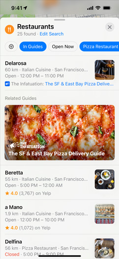 It’s quick and easy to find just what you’re looking for in Maps. Use ultra-targeted filters to search for restaurants by cuisine, price range, and whether they offer takeout. Or choose to see only places that are open right now. Want to broaden your search? Just move the map, and your search results update automatically. Want something closer to home? Tap Nearby to find local places in categories like Restaurants, Gas Stations, Coffee, Hotels, Bars, Fast Food, Groceries, and Shopping Centers. Locations are displayed on the map with colorful badges, making it even easier to pinpoint your picks.