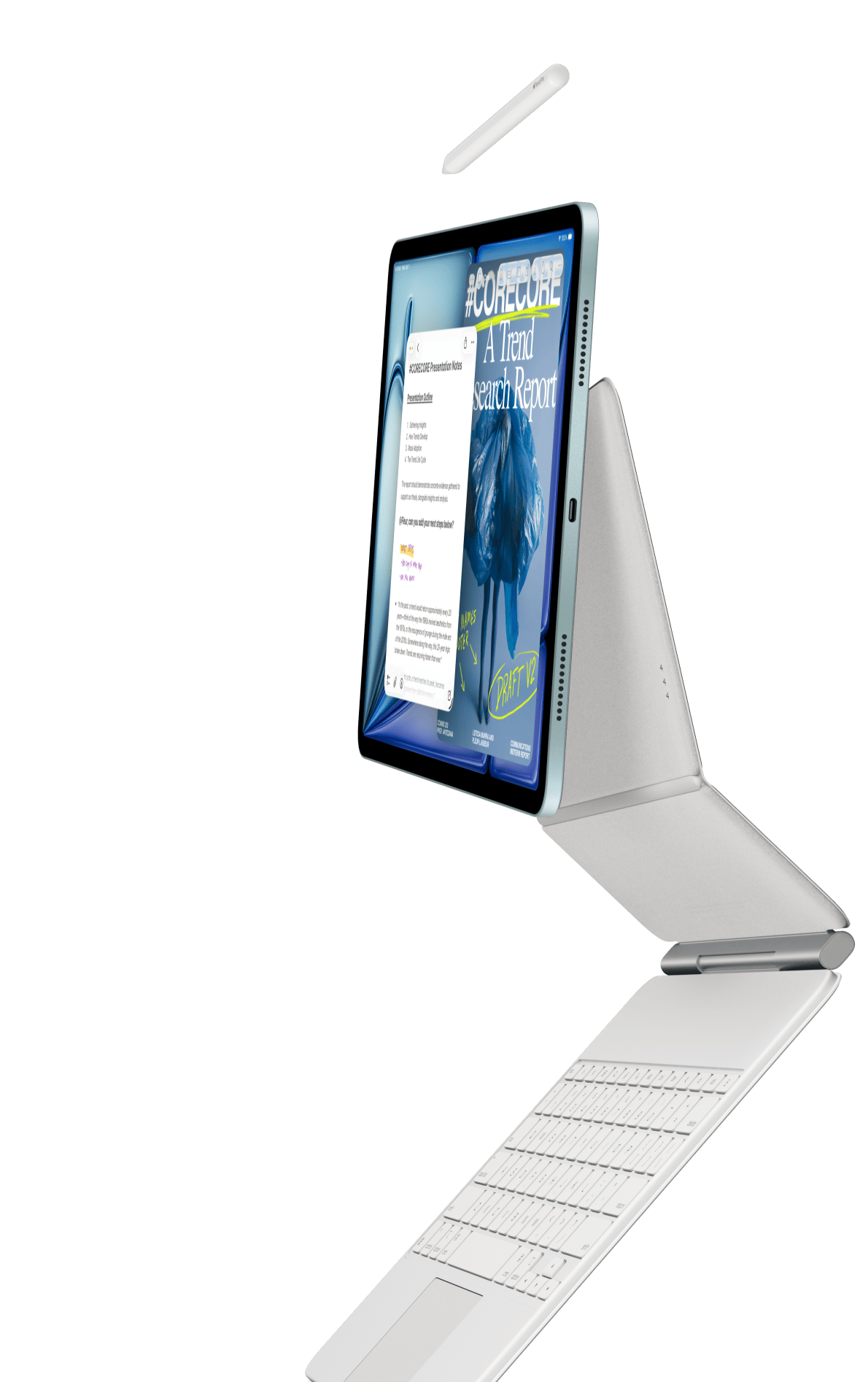 iPad Air egy iPad Airhez készült Magic Keyboardhoz és egy Apple Pencil Próhoz rögzítve