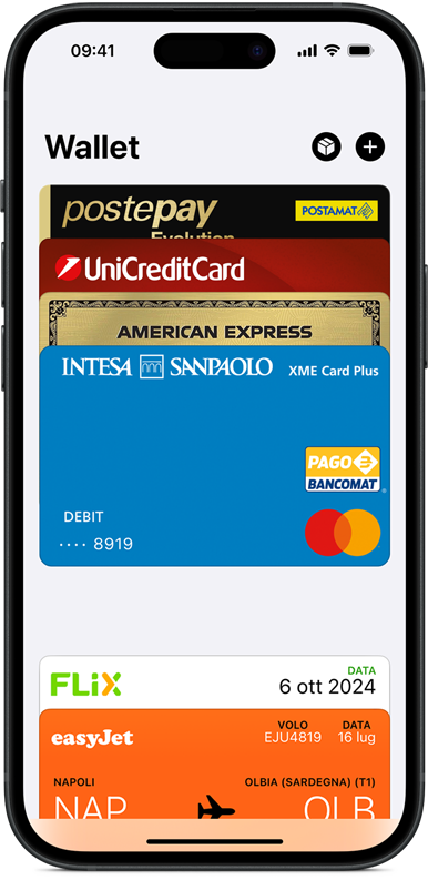 Si configura in un attimo. Il setup di Apple Pay è facilissimo. Apri l’app Wallet sull’iPhone e aggiungi la tua carta di credito o di debito: continuerai a godere dei vantaggi che ti ha sempre offerto, senza perdere punti o miglia.