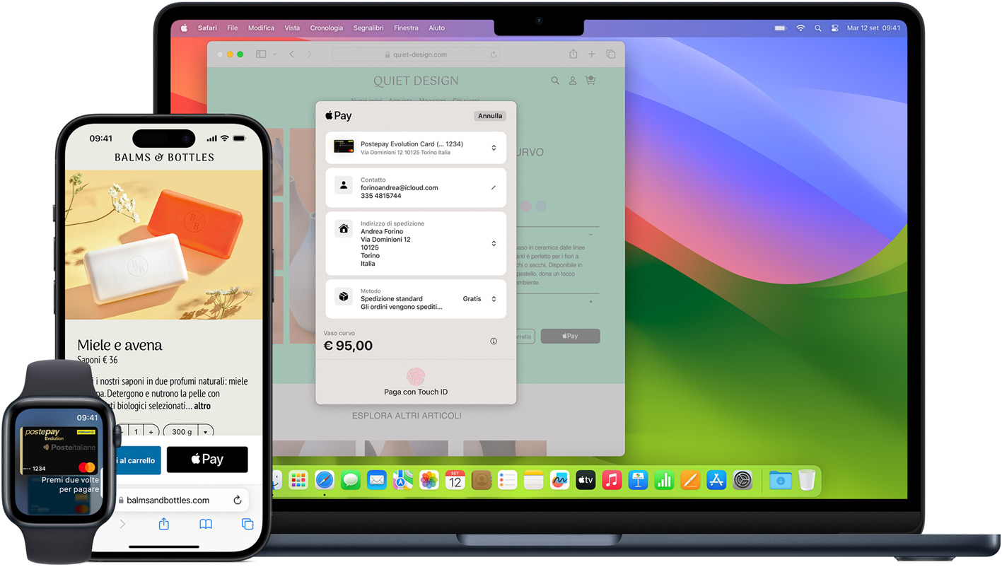 Nelle app e online. Su iPhone, iPad, Mac e non solo, usa Apple Pay per pagare comodamente i tuoi acquisti in Safari e altri browser, senza dover compilare moduli interminabili. Se sei su un dispositivo Apple, clicca o fai tap sul pulsante Apple Pay e paga con un tocco o con uno sguardo. Se invece non sei su un dispositivo Apple, inquadra il codice Apple Pay con la fotocamera del tuo iPhone e usa l’iPhone per completare l’acquisto.1 Con Apple Pay puoi anche abbonarti a servizi come Apple Music e Apple TV+, acquistare app e giochi sull’App Store e aggiungere spazio di archiviazione su iCloud.