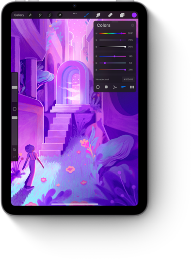 iPad mini shown in portrait view displaying a colorful Pixelmator screen.