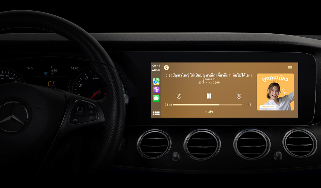 CarPlay ให้คุณฟังได้อย่างต่อเนื่องไม่มีสะดุดจาก iPhone ของคุณเมื่ออยู่ในรถ โดยการนำประสบการณ์การใช้งานที่ละเอียดครบถ้วนแบบเดียวกันมาอยู่บนส่วนควบคุมของรถ2 และคุณสามารถบอกให้ Siri เล่นตอนล่าสุดหรือควบคุมการเล่นได้ด้วย นอกจากนี้ Apple Podcasts ยังติดตั้งมาให้แล้วล่วงหน้าในรถหลายๆ รุ่น