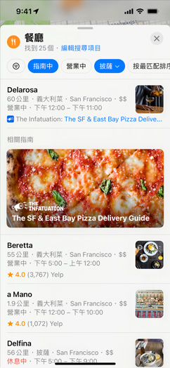 你可在「地圖」中快速且輕鬆地找到你想要的內容。還可使用極有針對性的過濾條件,依料理類別、價格範圍,以及能否外帶等條件來搜尋餐廳,也可以選擇只查看目前營業中的地點。如果想要擴大搜尋範圍,只要移動地圖,搜尋結果就會自動更新。如果想要找離家近一點的目標,只要輕點「附近」,就能依照餐廳、加油站、咖啡廳、飯店、酒吧、速食店、雜貨店及購物中心等類別,找出所在地的眾多地點。地圖上的顯示位置更配上彩色標記,使你能更輕鬆、精準找到你選定的目標。